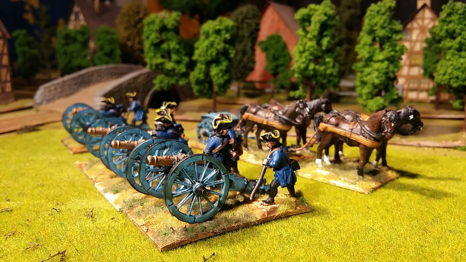 The top pictures shows a large howitzer battery of 12 guns. The bottom one shows the artillery allocated to the advance guard - 6pdrs on the left and 4pdrs on the right. The green coats are for the artillery crews of Freikorps von Kleist.